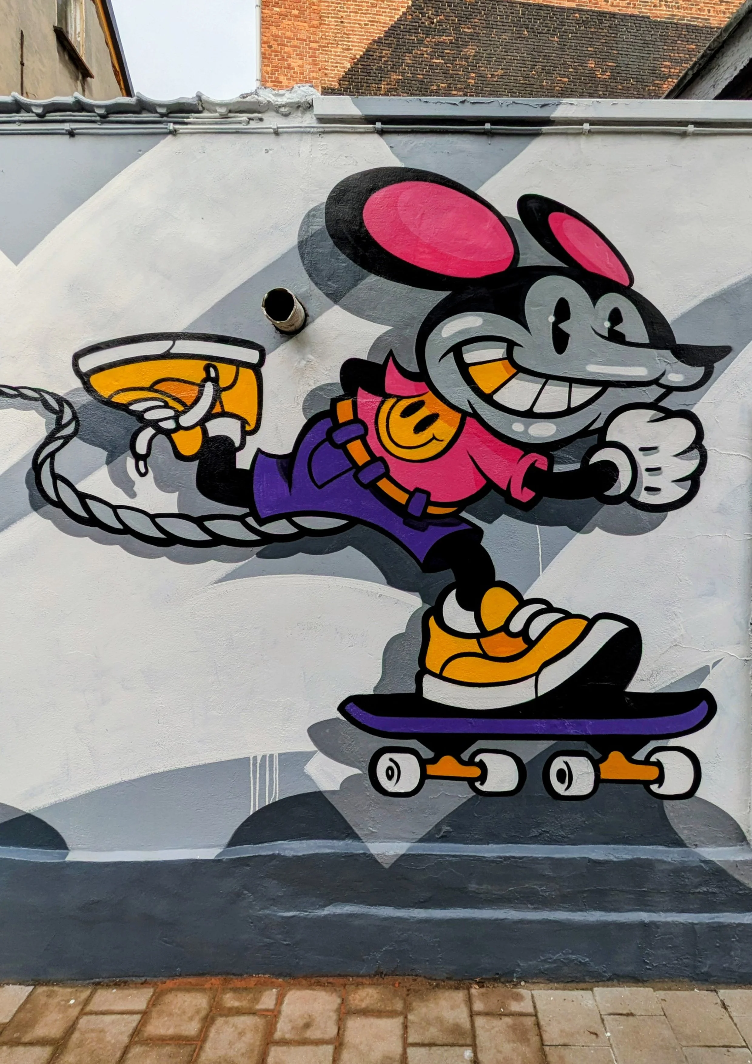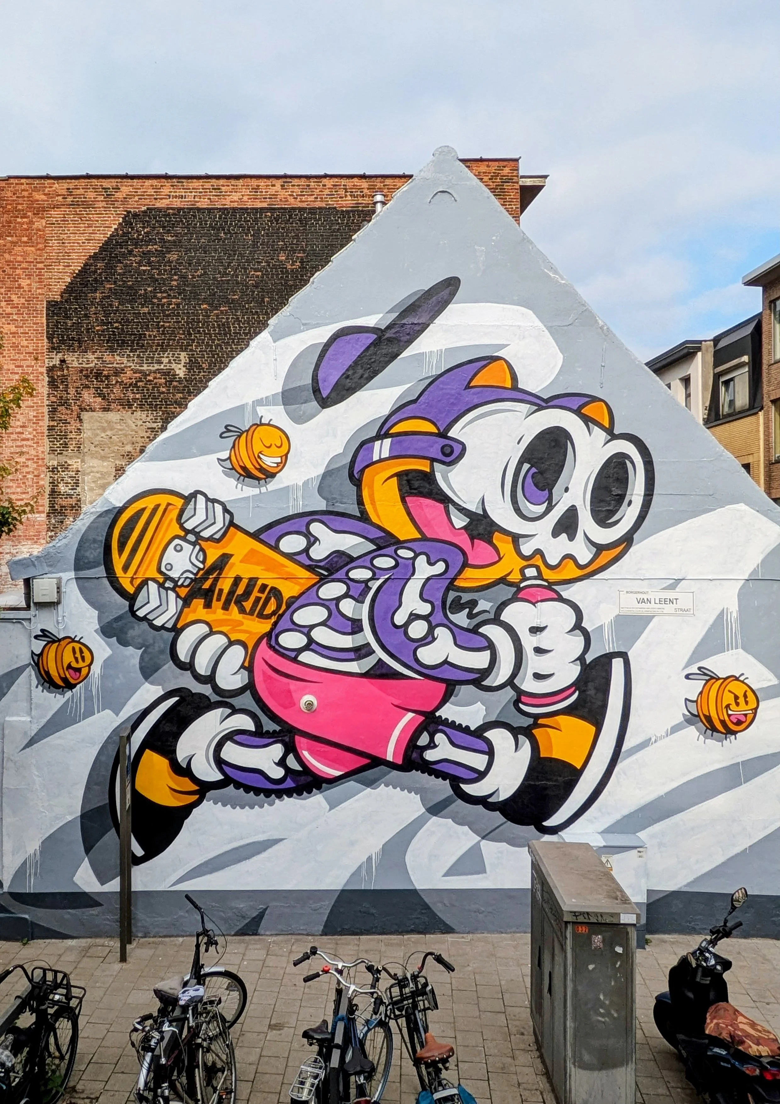 Deze muurschildering brengt je terug naar een tijd zonder zorgen — waar skateboarden, lachen en gewoon genieten van de dag centraal staan. Een speelse mural vol kleur en energie die de buurt opfleurt en een glimlach op elk gezicht tovert.